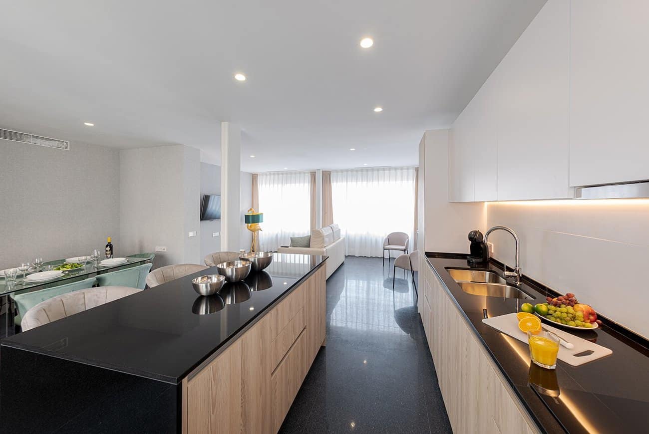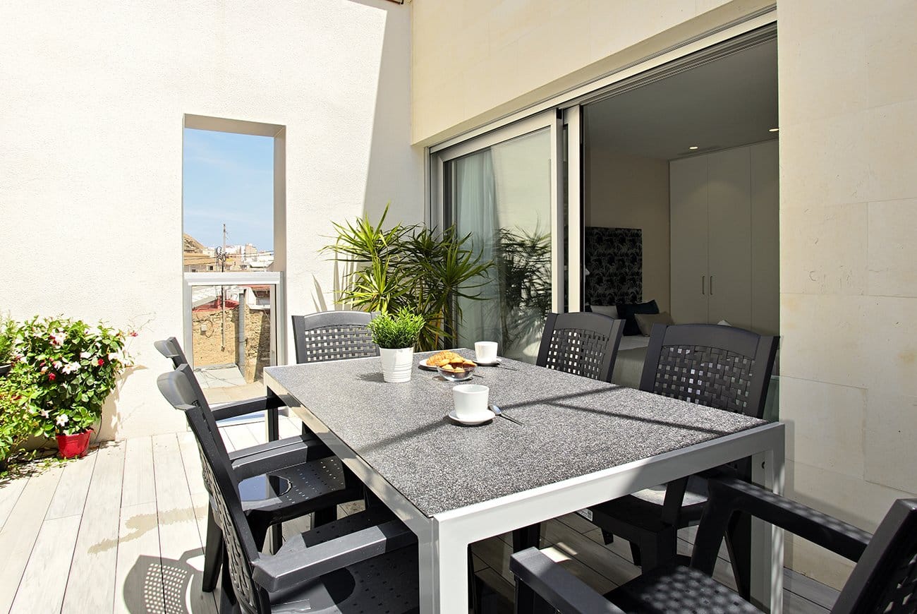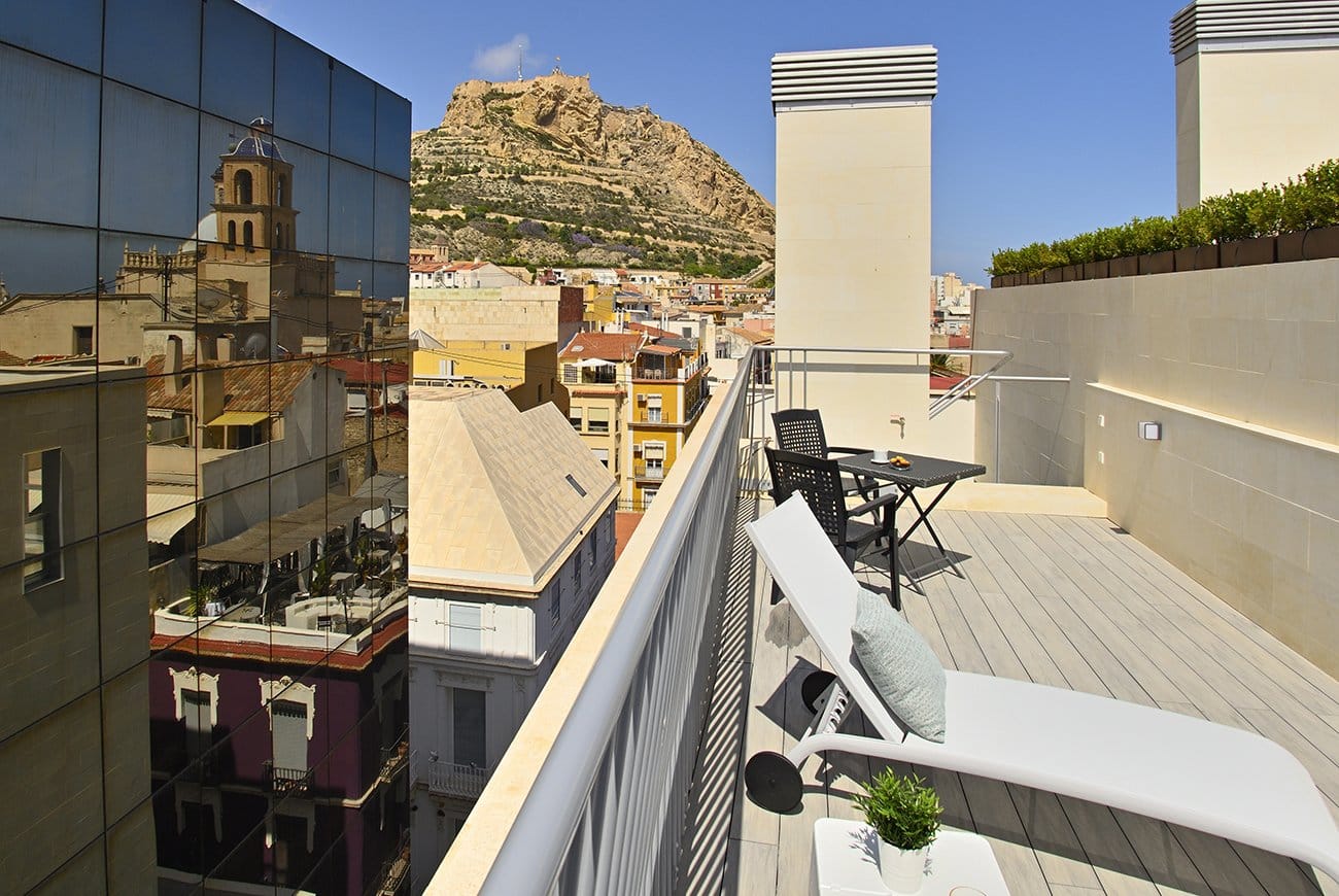 Coronando la cima del Edificio Rambla 24 encontramos el espectacular Ático, con Terraza a doble altura, con vistas al Castillo Santa Bárbara. El amplio apartamento consta de tres habitaciones dobles y dos baños completos, uno de ellos en suite y adaptado, salón comedor con sofá cama, cocina completamente equipada con isla y taburetes. El apartamento Incluye una terraza privada a doble altura equipada con mesa, sillas y tumbonas.